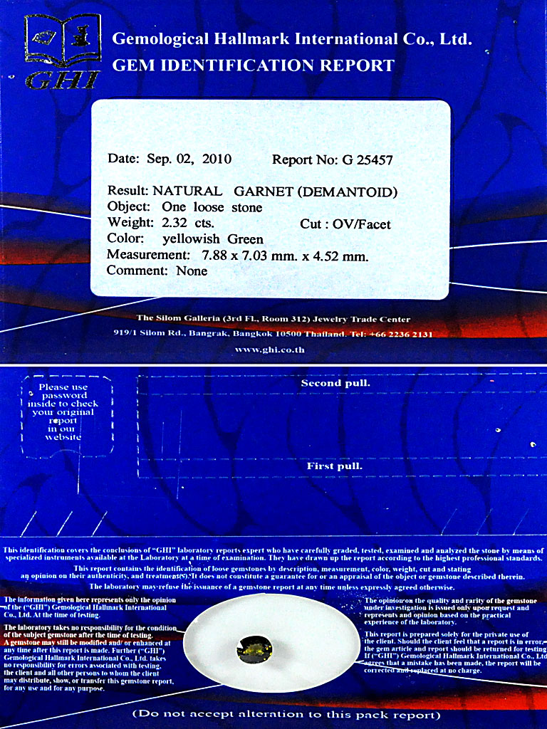 Demantoid Certified 2.32 Ct. Oval Shape 7.88 x 7.03 Mm Natural Gemstone Unheated