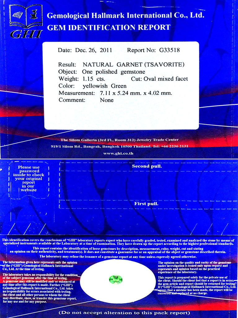 Certified Yellowish Green Tsavorite Garnet 1.15 Ct. Oval 7.11 x 5.24 Mm. Natural