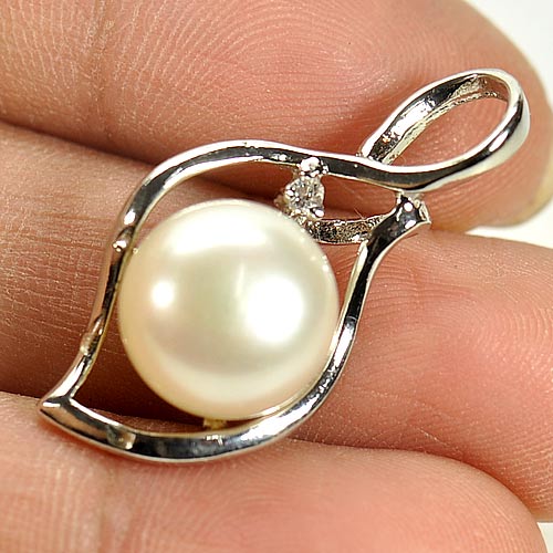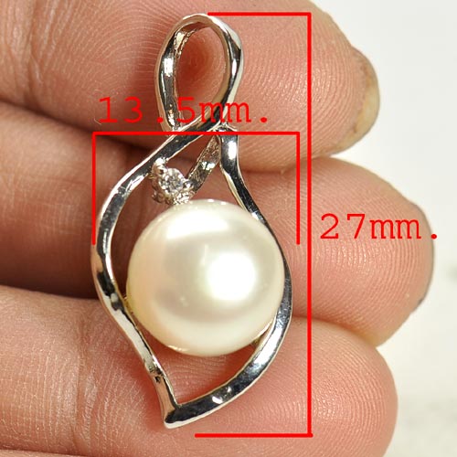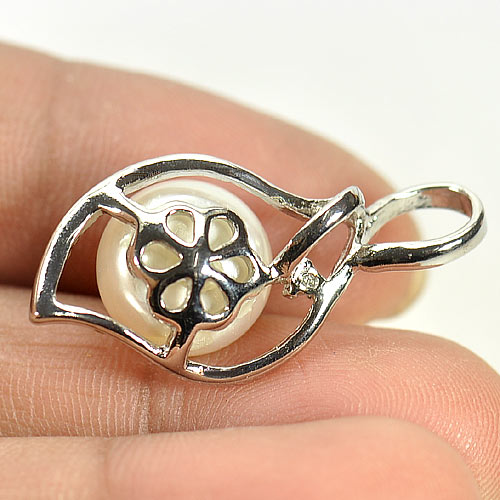 2.83 G. Round Cabochon Natural White Pearl Rhodium Silver Plated Pendent