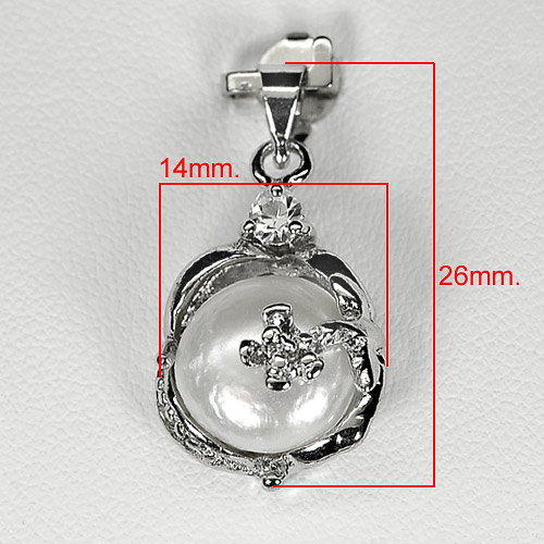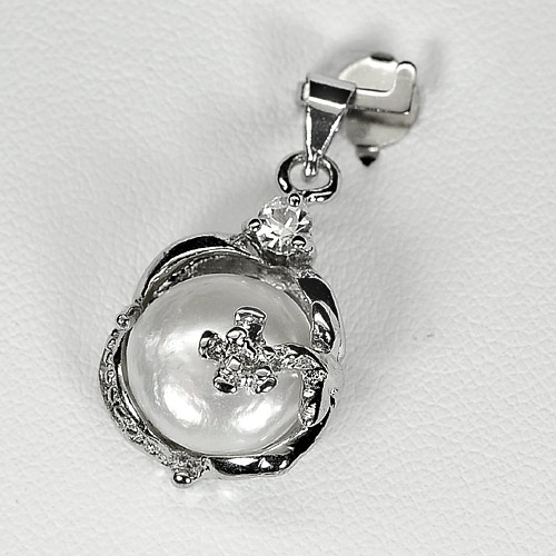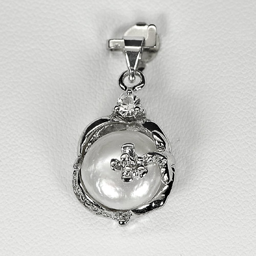 Nice 3.29 G. Round Cabochon Natural White Pearl Rhodium Silver Plated Pendant