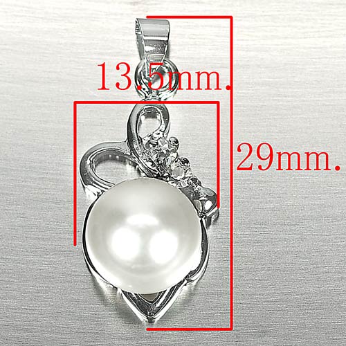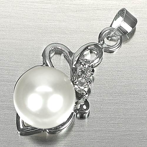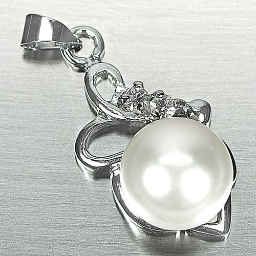 3.33 G. Round Cabochon Natural White Pearl Rhodium Silver Plated Pendant