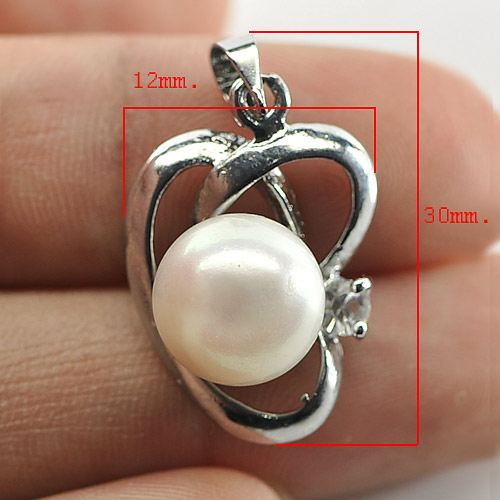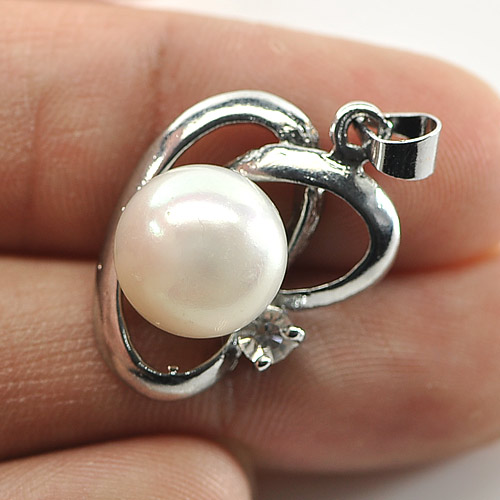 2.84 G. Natural White Pearl Rhodium Silver Plated Pendant Round Cabochon