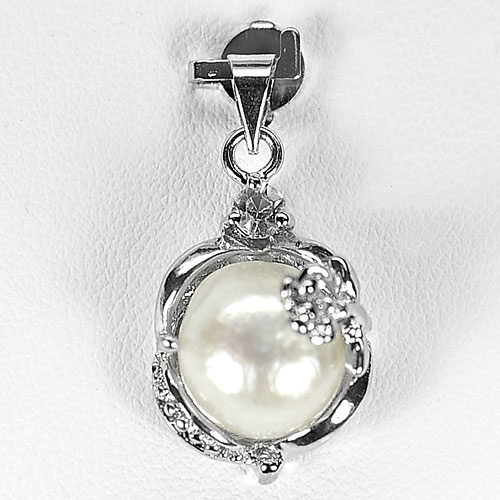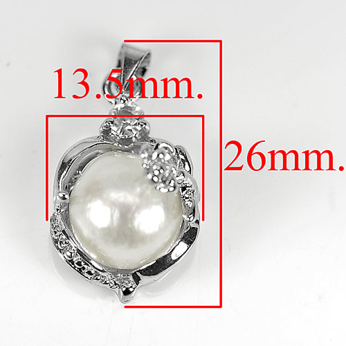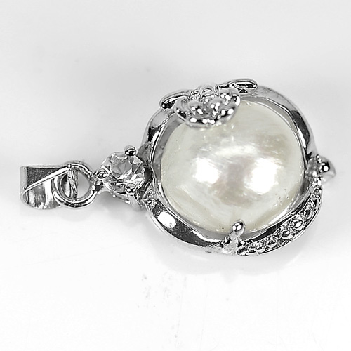 3.57 G. Round Cabochon Natural White Pearl Rhodium Silver Pendant