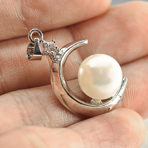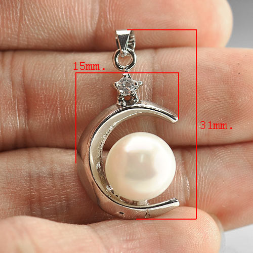3.18 G. Round Cabochon Natural White Pearl Rhodium Silver Plated Pendant