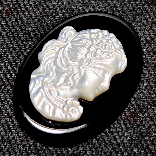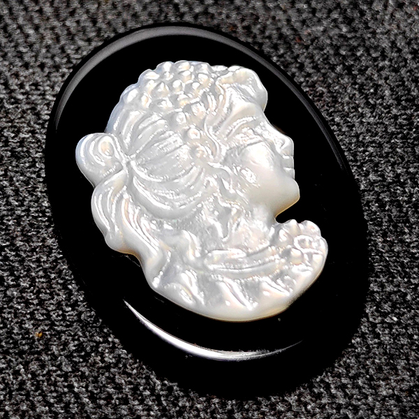 Natural White Sea Shell 6.44 Ct. Woman Carving Cameo on Onyx 18.2 x 13 Mm
