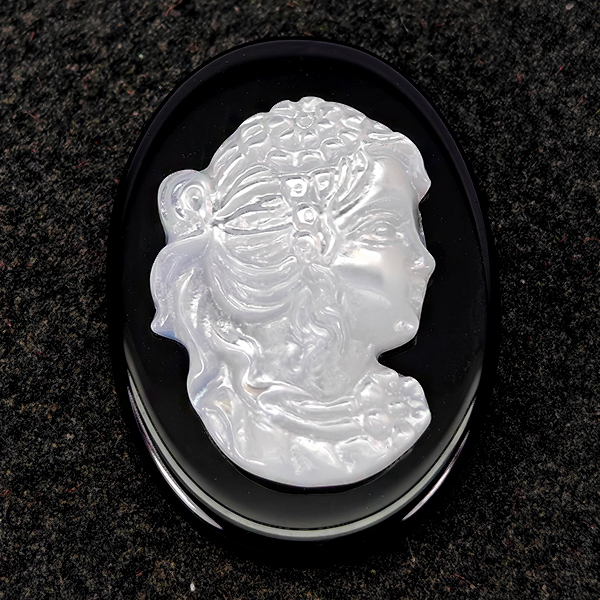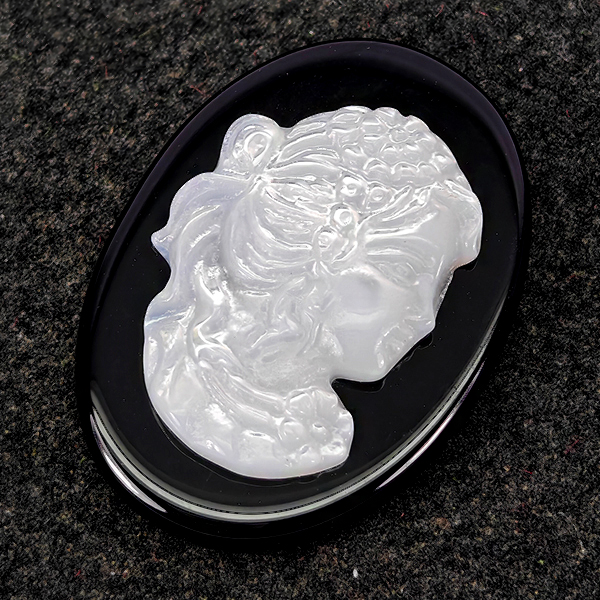 Natural White Sea Shell 6.16 Ct. Woman Carving Cameo on Onyx 12.8 x 7.9 Mm