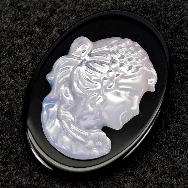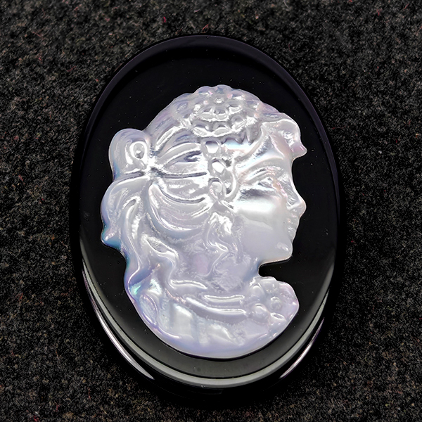 Natural White Sea Shell 6.18 Ct. Woman Carving Cameo on Onyx 12.9 x 17.8 Mm