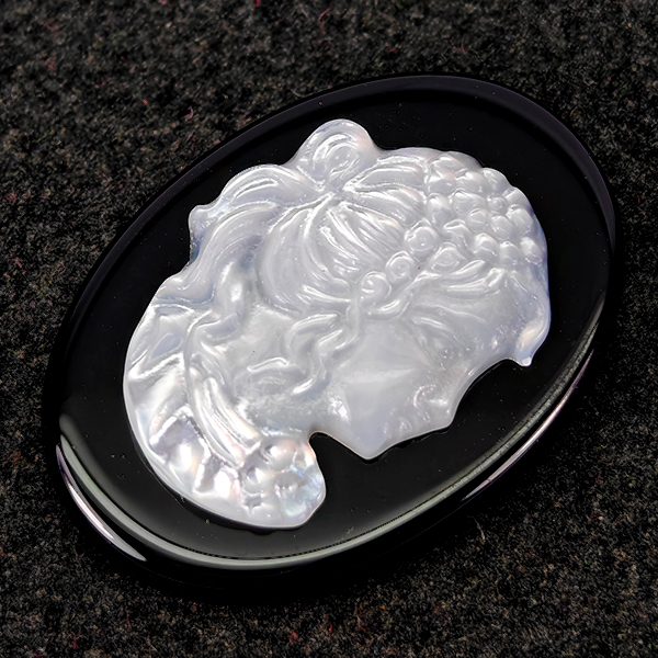 Natural White Sea Shell 6.24 Ct. Woman Carving Cameo on Onyx 12.9 x 8.1 Mm