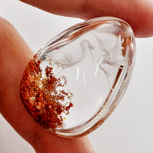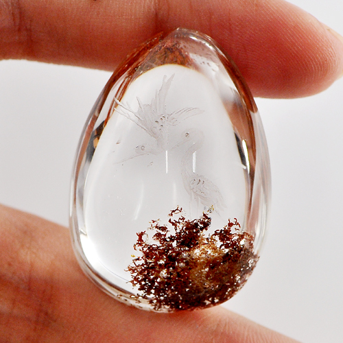 Moss Quartz Carving Birds Inner 75.00 Ct. Pear Cabochon 35 x 25 Mm. Natural Gem