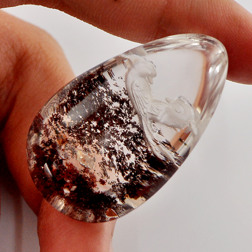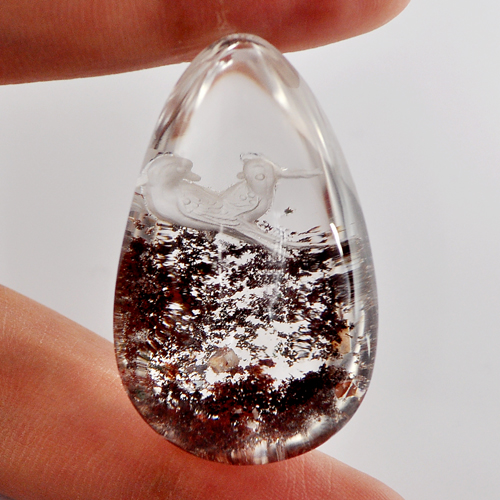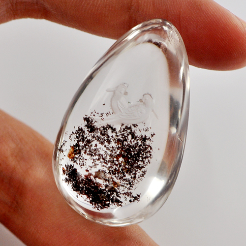 Moss Quartz 100 Ct. Pear Carving Birds Inner Cabochon 39 x 23 Mm. Natural Gem