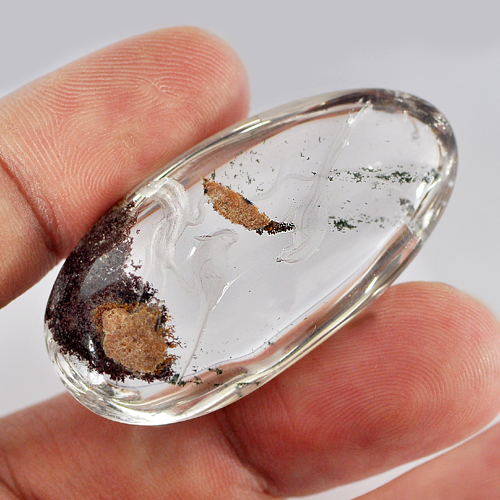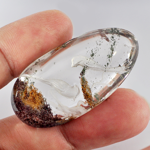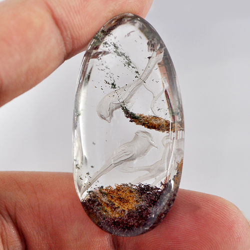 Good 84.30 Ct. Natural Inner Moss Brown White Quartz Carving Birds Pear Cabochon