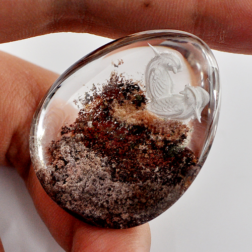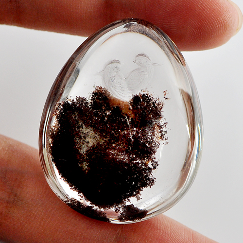 Birds Carving Inner Moss White Quartz Pear Cabochon 100 Ct. Natural Gem
