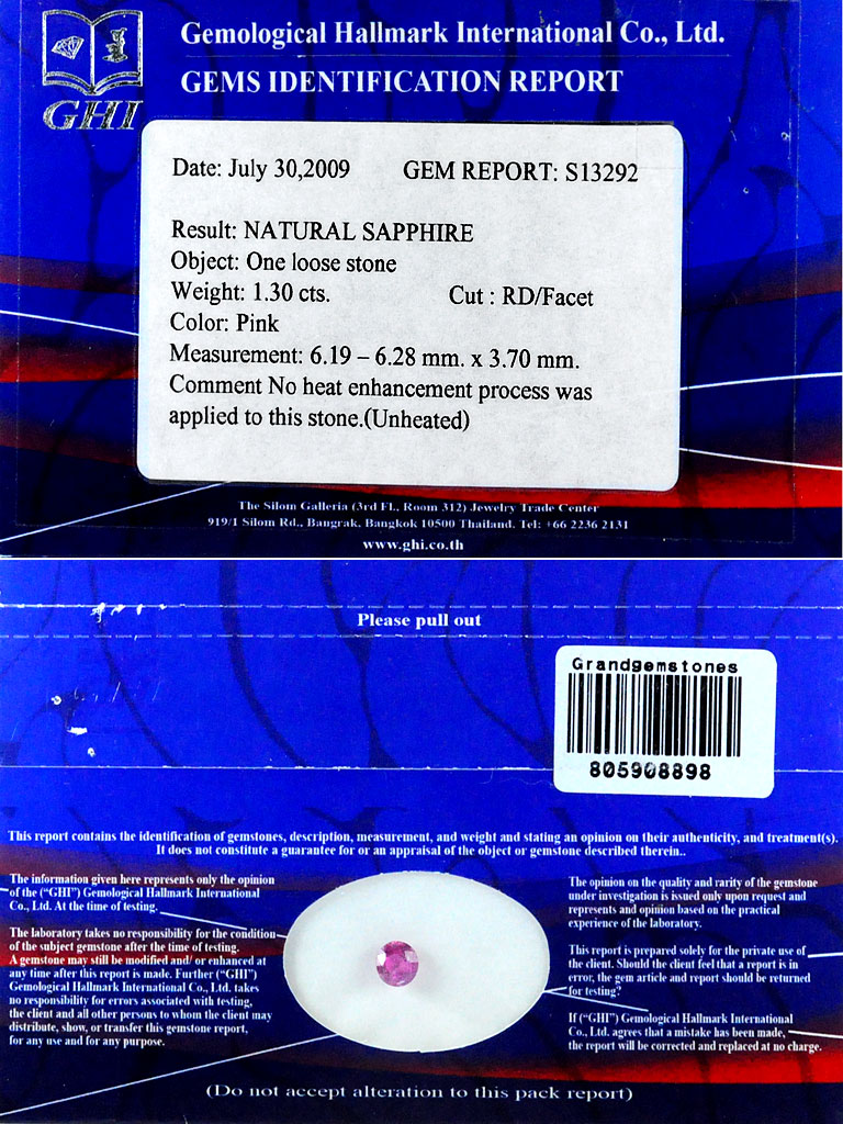 1.30 Ct. 6.4 Mm. Certified Unheated Pink Winza Sapphire