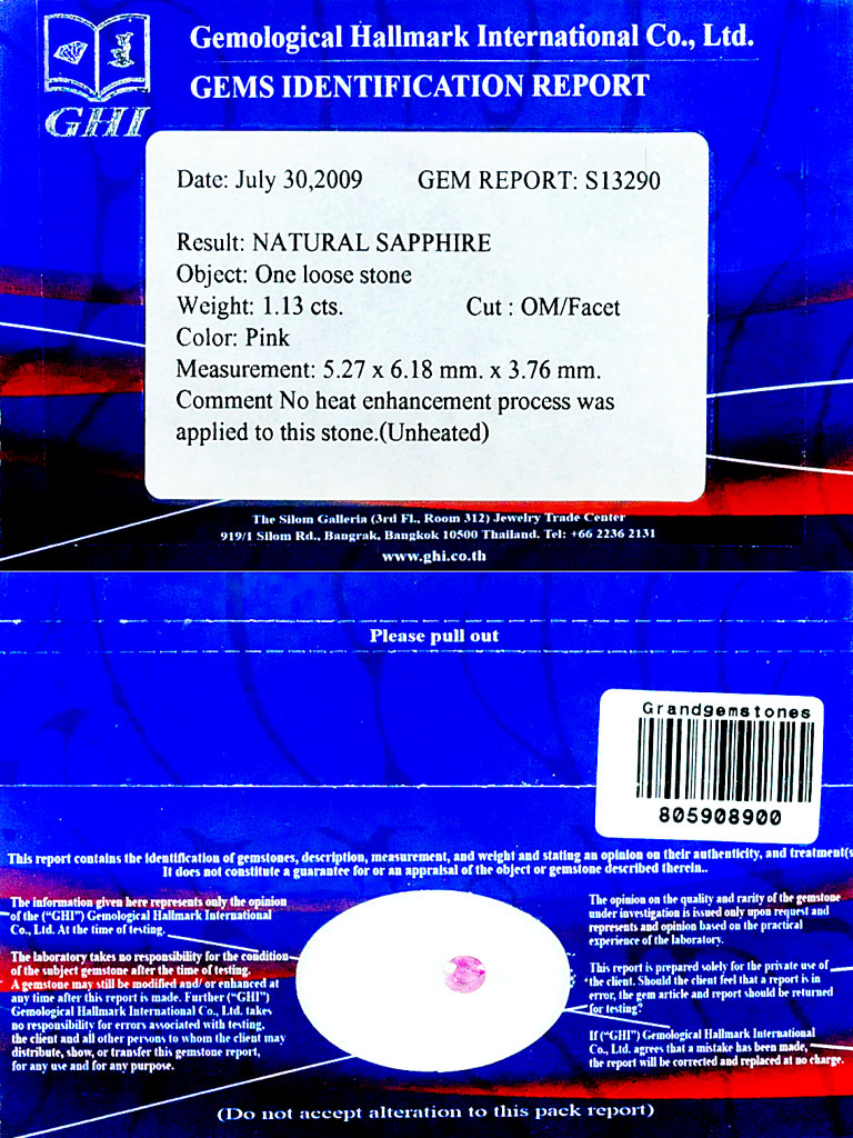 1.12 Ct. Certified Unheated Hot Pink Winza Sapphire Gem