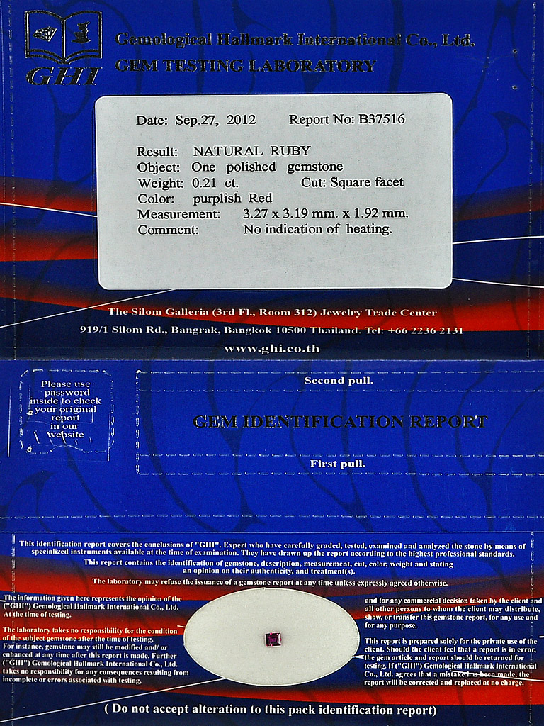 Certified Natural Unheated Purplish Red Ruby 0.21 Ct. Square Shape 3.27 x 3.19Mm