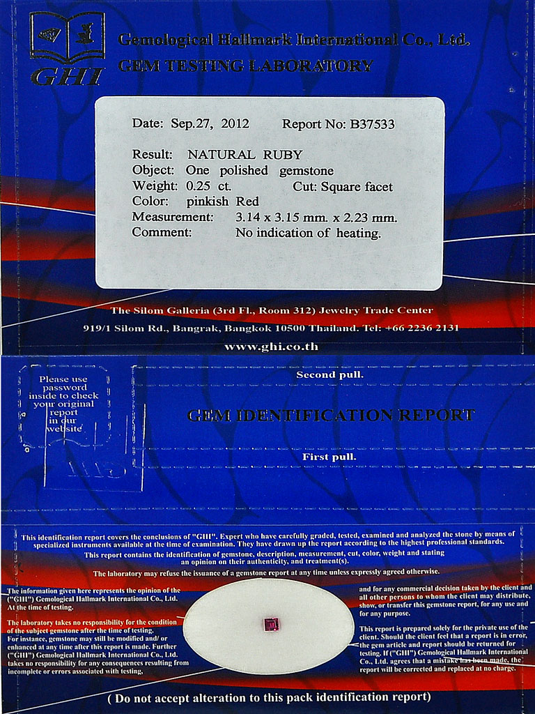 Certified Unheated 0.25 Ct. Vivid Natural Pinkish Red Ruby Square Mozambique