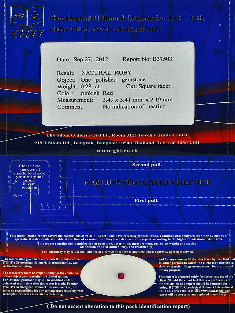 Certified Unheated Pinkish Red Ruby 0.28 Ct. Square Shape Natural Gem Mozambique