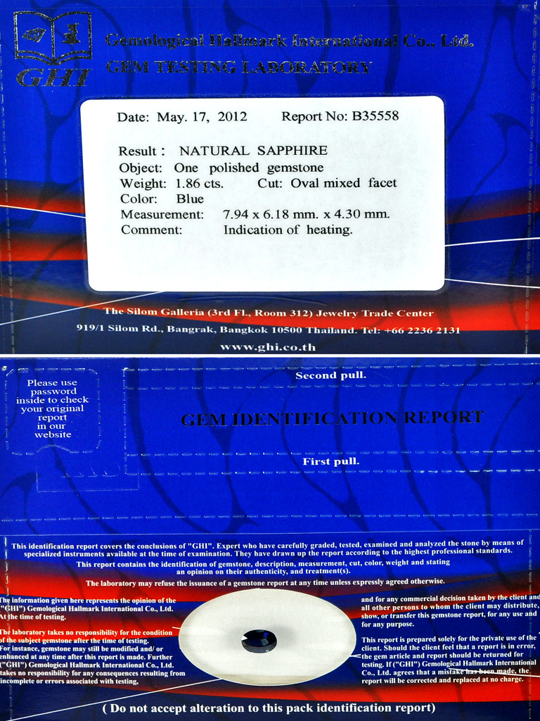 Blue Sapphire Certified 1.86 Ct. Oval 7.94 x 6.18 Mm. Natural Gemstone Thailand