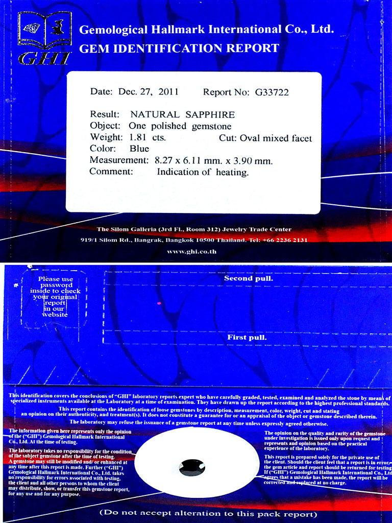 Blue Sapphire Oval Shape 8.27 x 6.11Mm.1.81 Ct. Certified Natural Gem Madagascar
