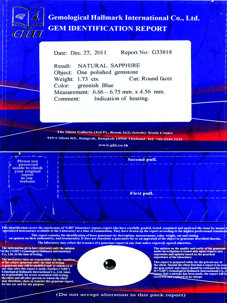 Certified Greenish Blue Sapphire 1.73 Ct. Round 6.66 Mm. Natural Gem Madagascar