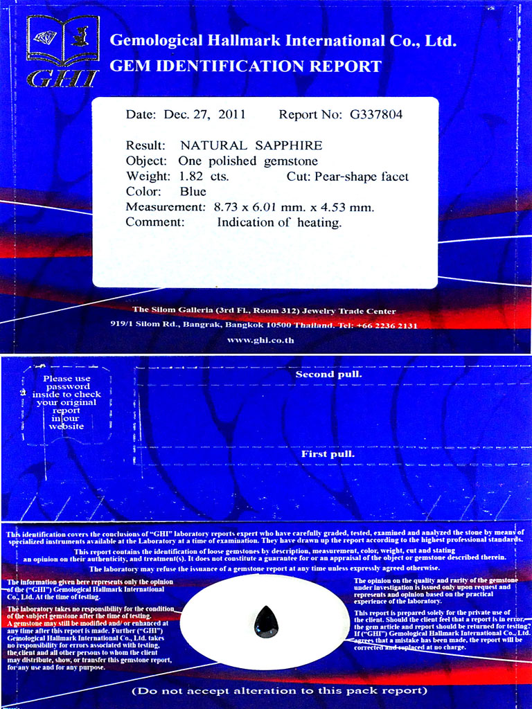Certified Blue Sapphire 1.82 Ct. Pear Shape 8.73 x 6.01 Mm. Natural Gemstone