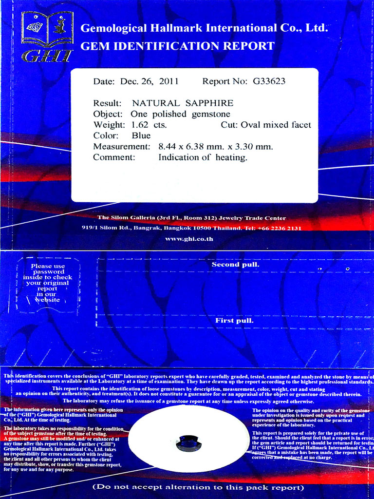 Certified Blue Sapphire 1.62 Ct. Oval Shape 8.44 x 6.38 Mm. Natural Gemstone