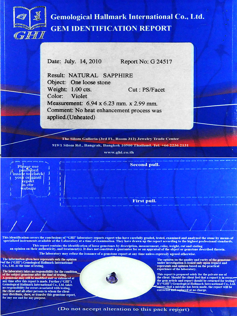 Certified Unheated 1.00Ct. Pear Shape Natural Violet Sapphire
