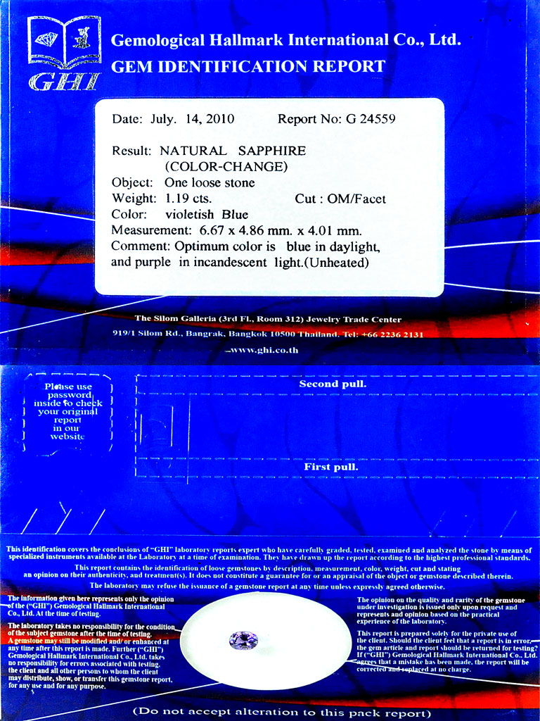 Certified Unheated Color Change Sapphire 1.19 Ct. Oval Shape Natural Madagascar