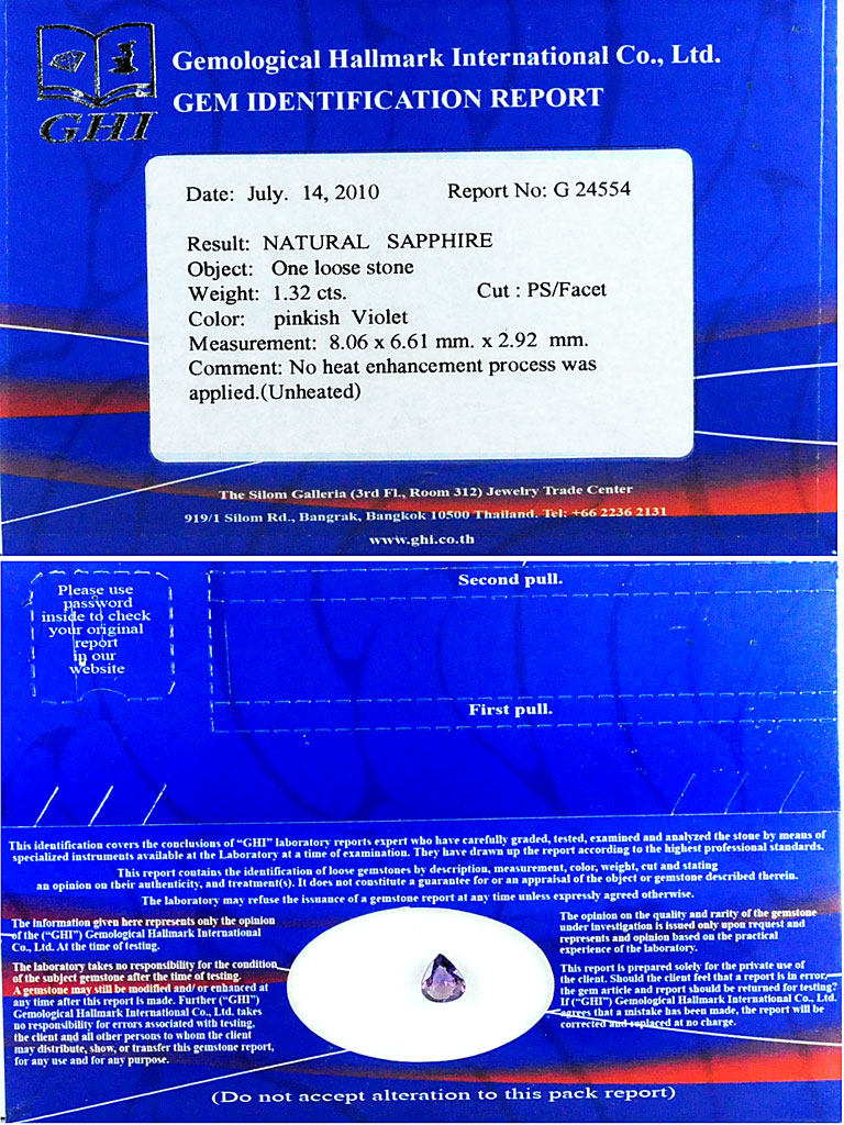 Sapphire Pinkish Violet Certified 1.32 Ct. Pear Shape Natural Unheated Gemstone