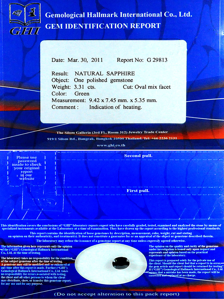 Certified Green Sapphire 3.31 Ct. Oval 9.42 x 7.45 Mm. Natural Gemstone Thailand