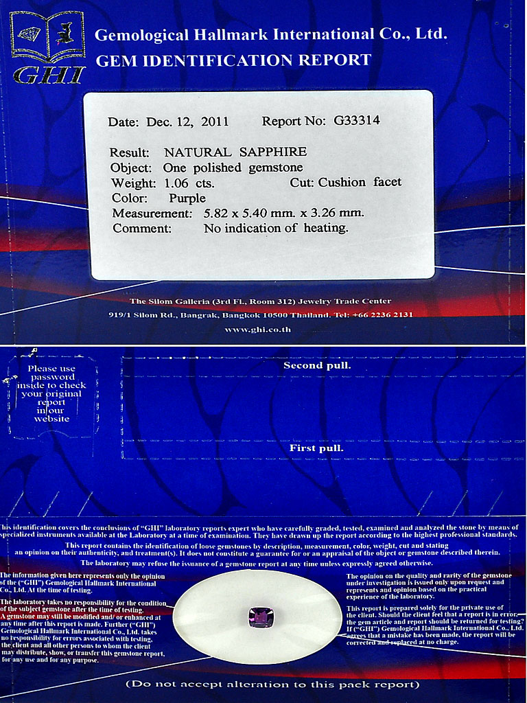 Certified Unheated 1.06 Ct. Cushion Natural Purple Sapphire