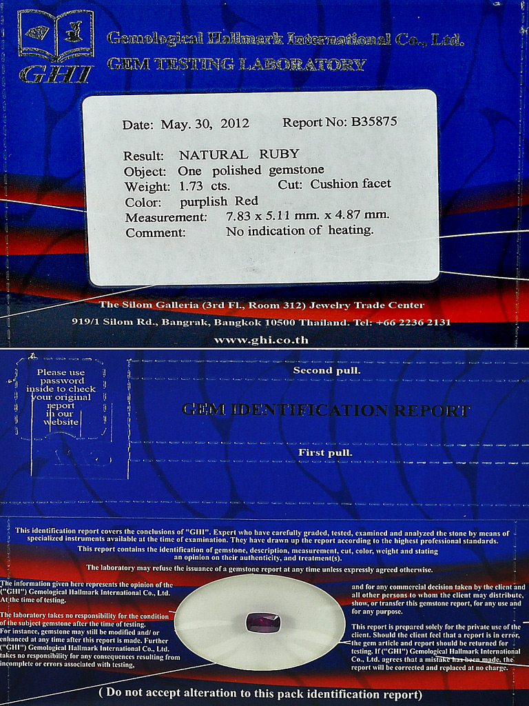Certified Unheated Purplish Red Ruby 1.73 Ct Cushion 7.83 x 5.11 Mm. Natural Gem