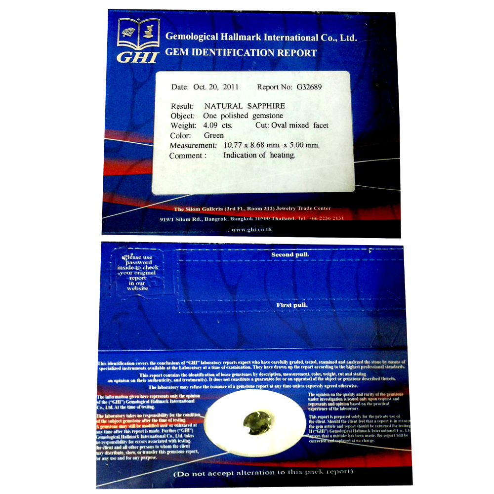 Certified Green Sapphire 4.09 Ct. Clean Oval 10.77 x 8.68 Mm. Natural Gemstone