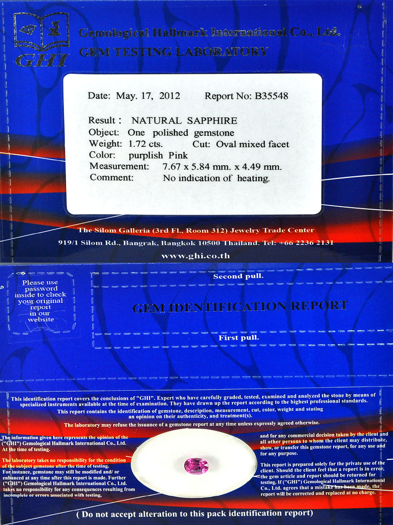 Certified Unheated 1.72 Ct. Natural Purplish Pink Sapphire Gemstone Oval Shape
