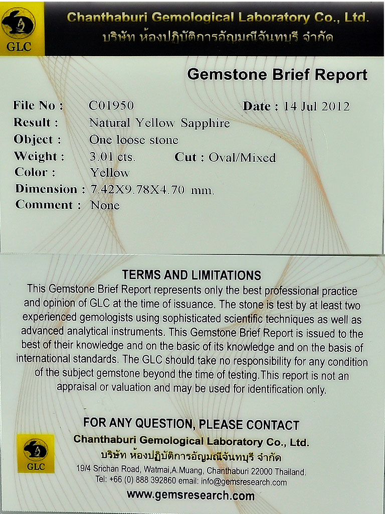 Certified Yellow Sapphire 3.01 Ct. VVS Oval 7.42 x 9.78 Mm. Natural Gem Thailand