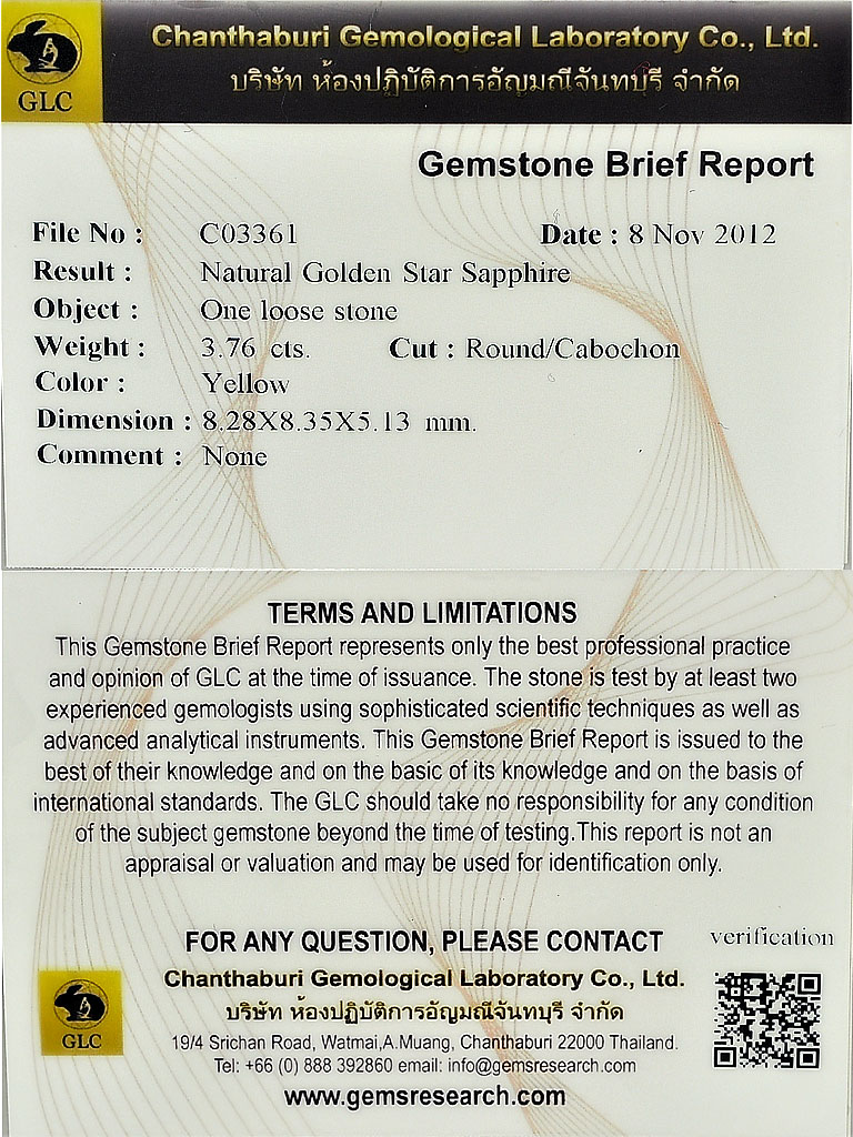 Certified Star Sapphire Golden 6 Ray 3.76 Ct. Round Cabochon Natural Gemstone