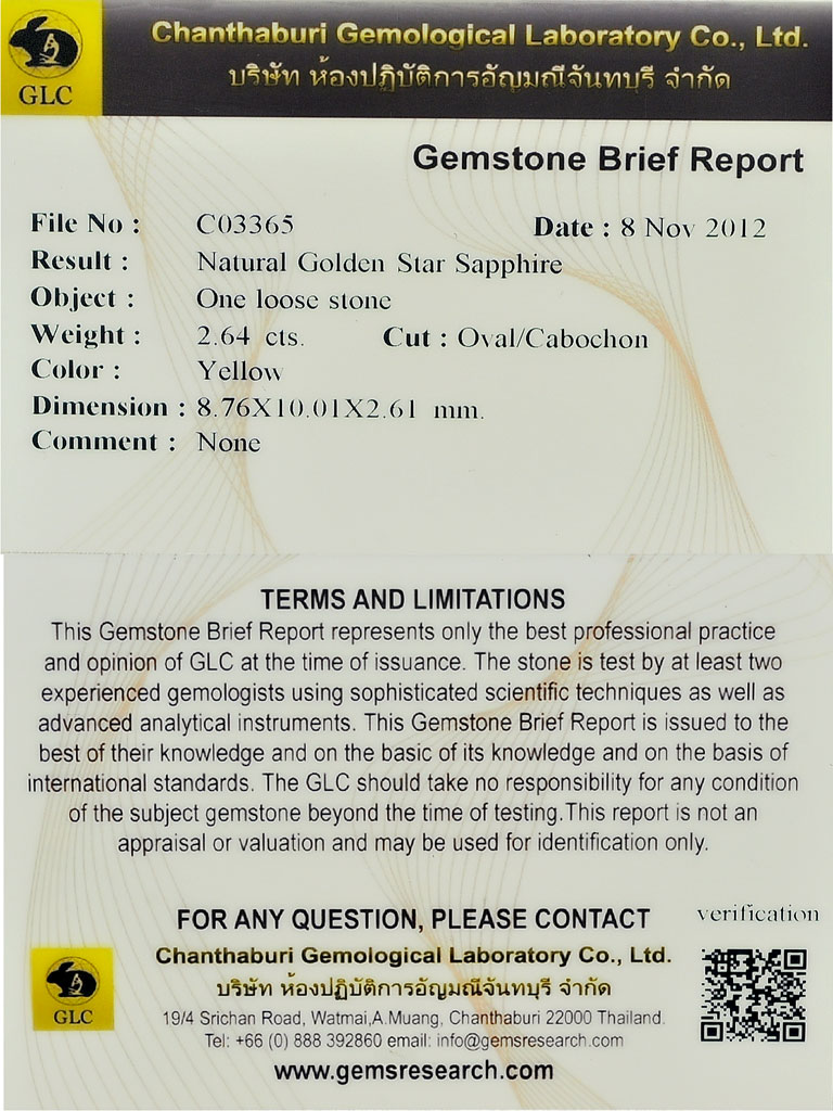 Certified Star Sapphire Golden 6 Ray 2.64 Ct. Oval Cabochon Natural Gem Thailand