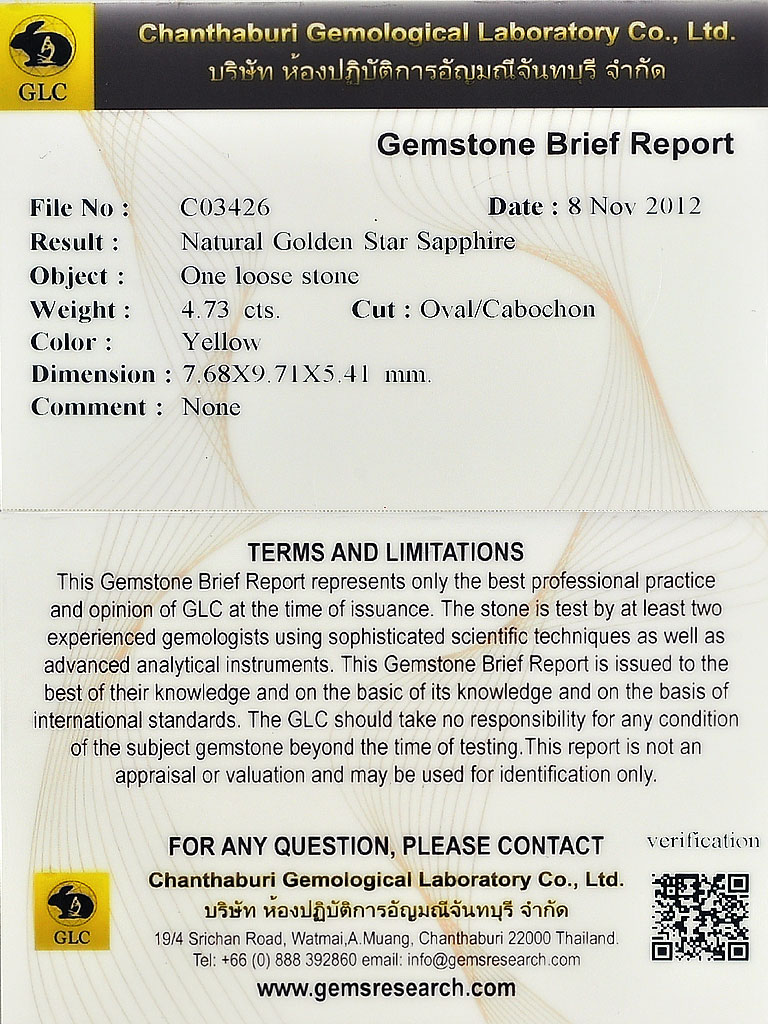 Certified 4.73 Ct. Natural Gem 6 Ray Golden Star Sapphire Oval Cabochon