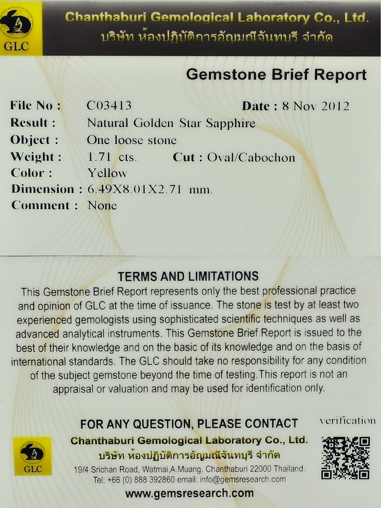 Certified 1.71 Ct. Natural Gemstone 6 Ray Golden Star Sapphire Unheated Thailand