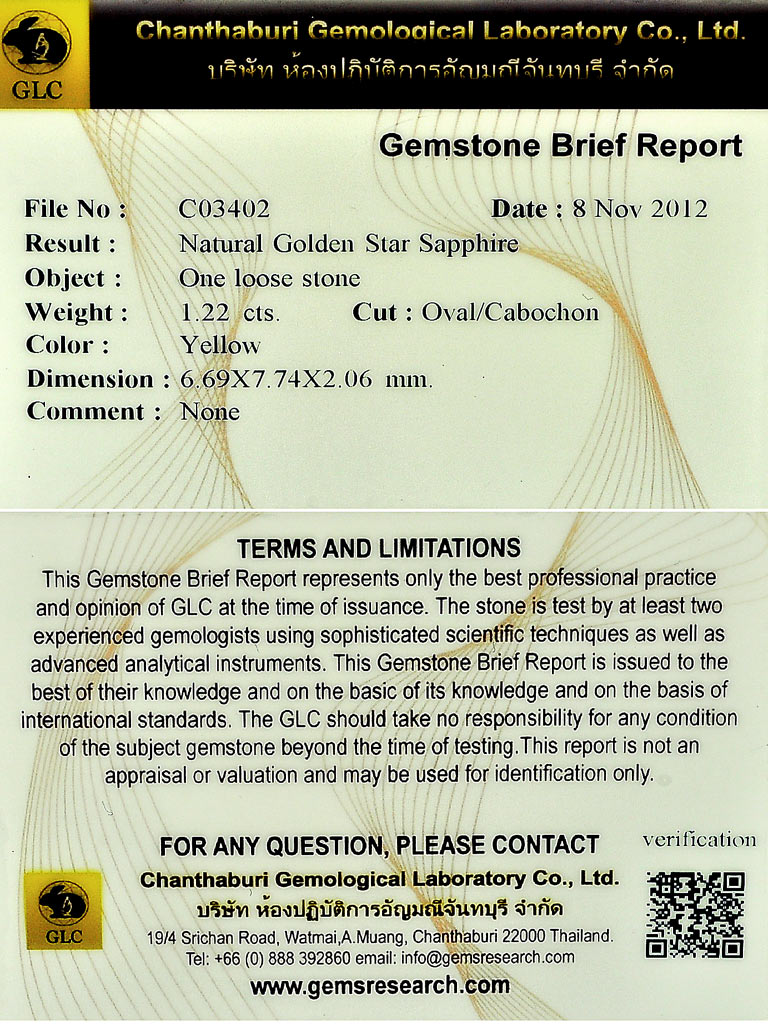 Star Sapphire Golden 6 Ray Certified 1.22 Ct. Oval Cabochon Natural Gemstone