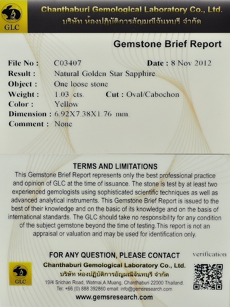 Golden Star Sapphire 6 Ray Certified 1.03 Ct. Natural Gem Oval Cabochon Thailand