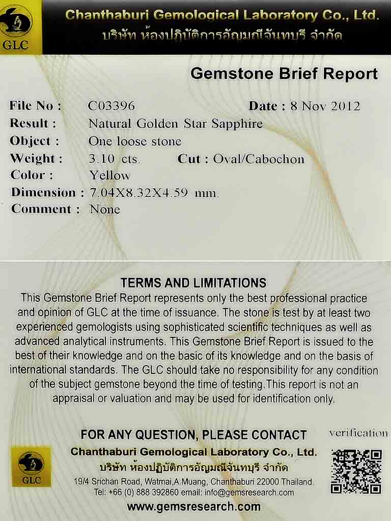 Certified Star Sapphire Golden 6 Ray 3.10 Ct Oval Cab 7.04 x 8.32 Mm Natural Gem
