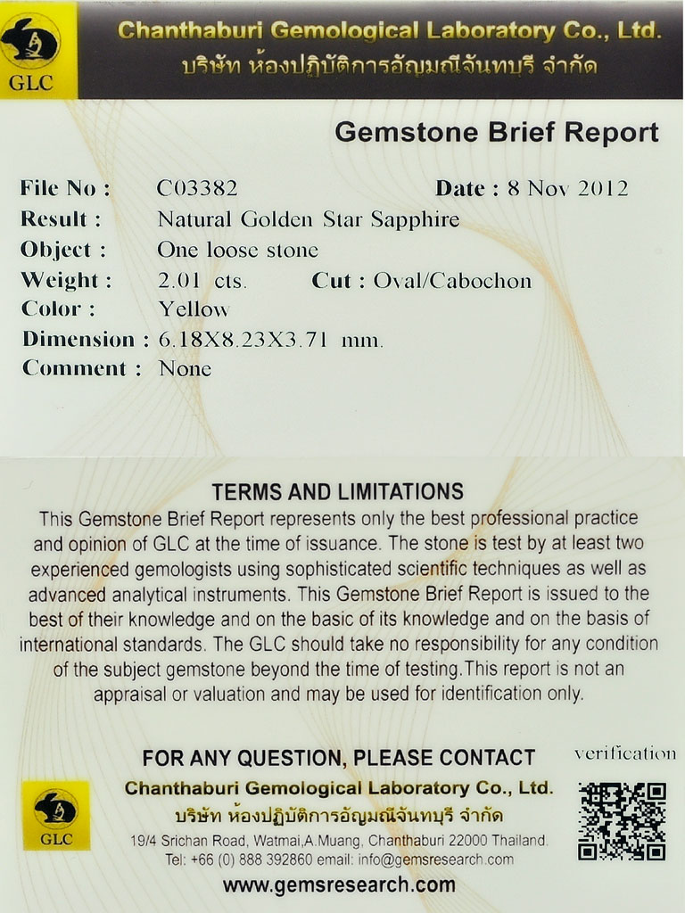 Golden Star Sapphire 6 Ray Certified 2.01 Ct. Oval Cabochon Natural Gem Thailand