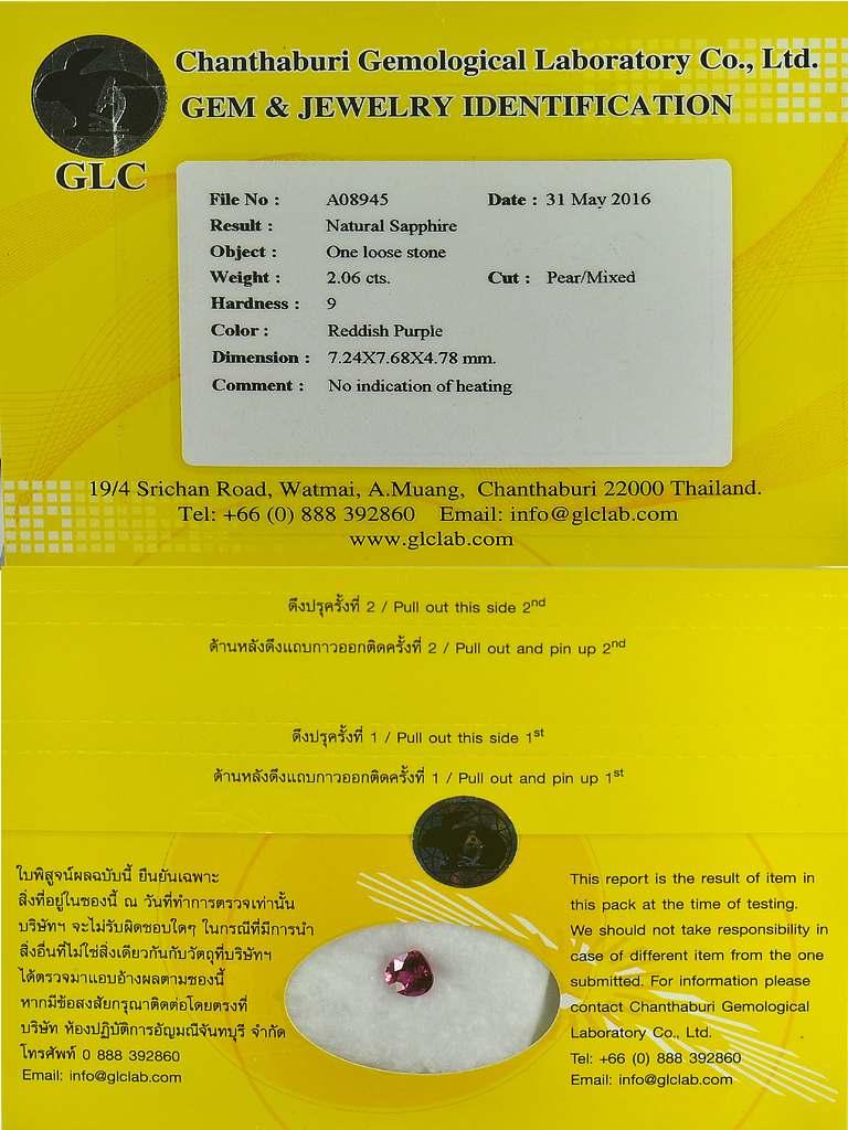 Sapphire Reddish Purple 2.06 Ct. Certified VVS Natural Unheated Pear Madagascar