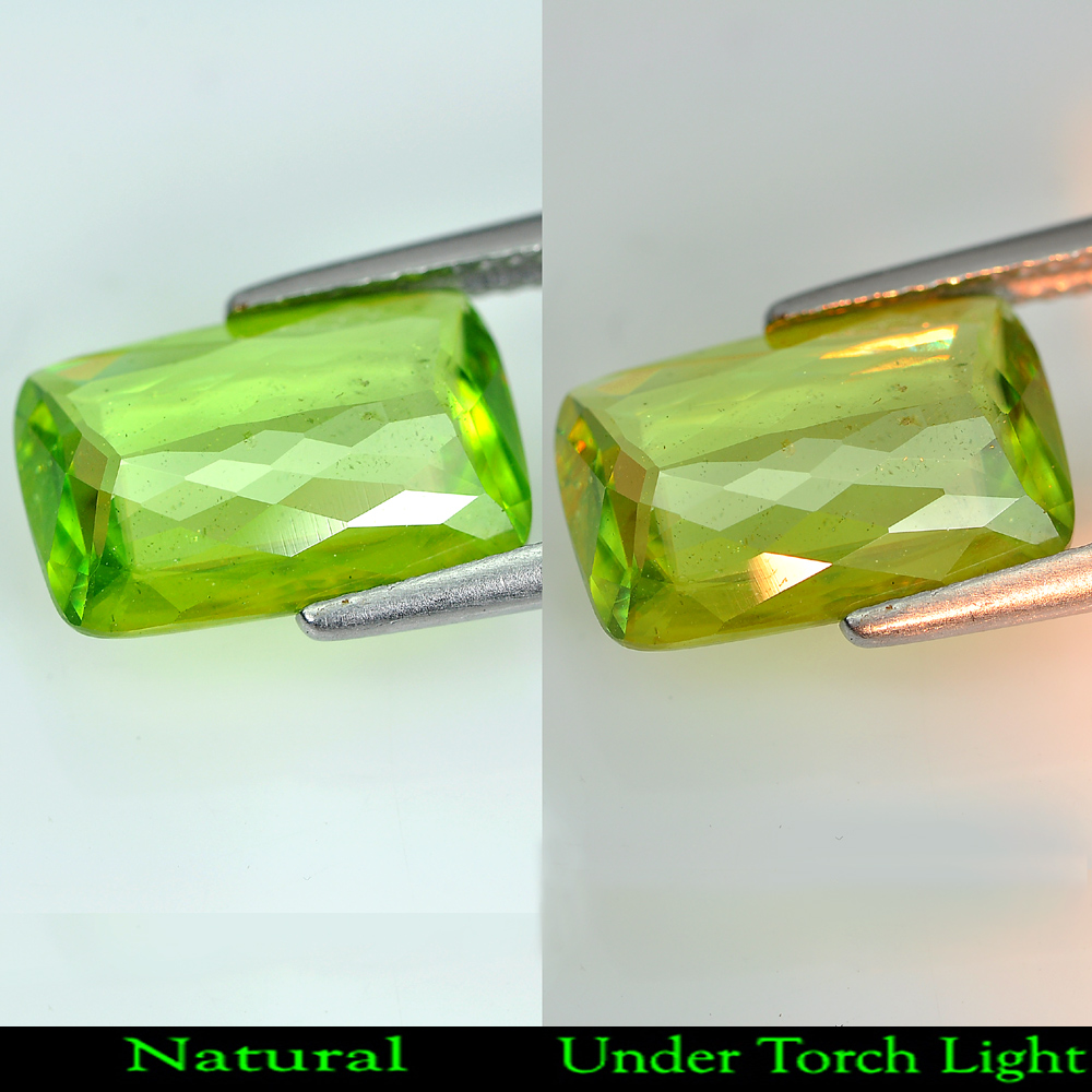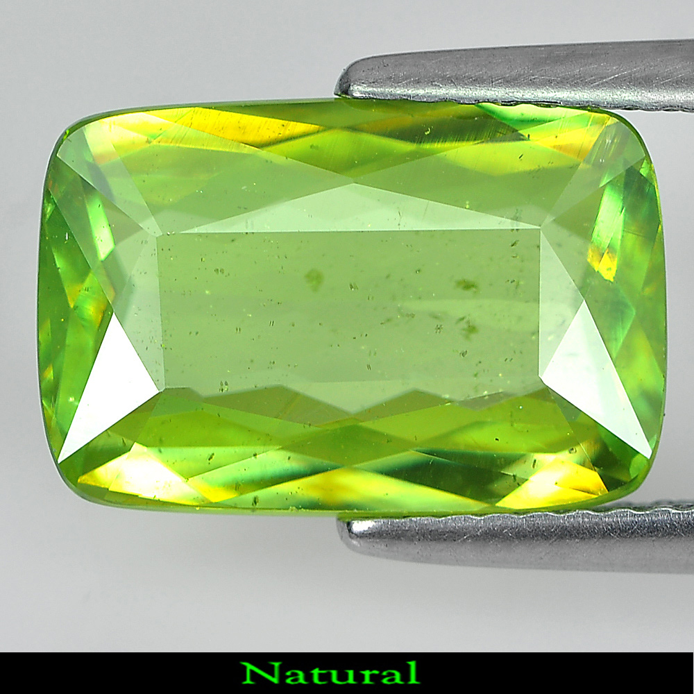 Natural Gemstone Green Sphene With Rainbow Spark 4.58 Ct. Cushion 13.2 x 8.8 Mm.