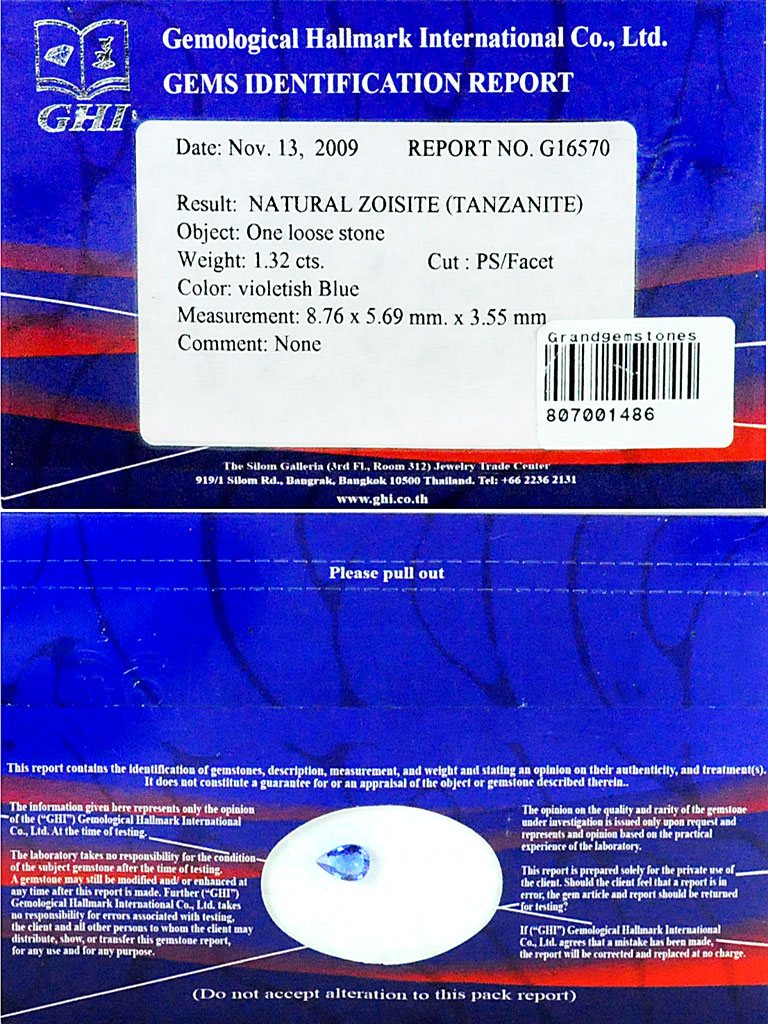 Certified 1.32 Ct. Pear Shape Natural Gem Violetish Blue Tanzanite From Tanzania