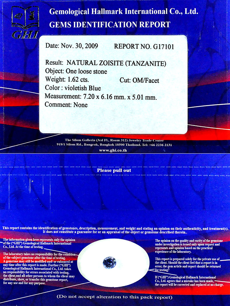 Certified Violetish Blue Tanzanite 1.62 Ct. VVS Oval 7.20 x 6.16 Mm. Natural Gem