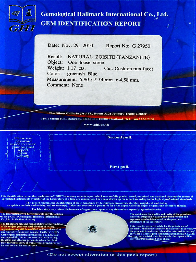 Certified 1.17 Ct. Natural Gem Greenish Blue Tanzanite From Tanzania