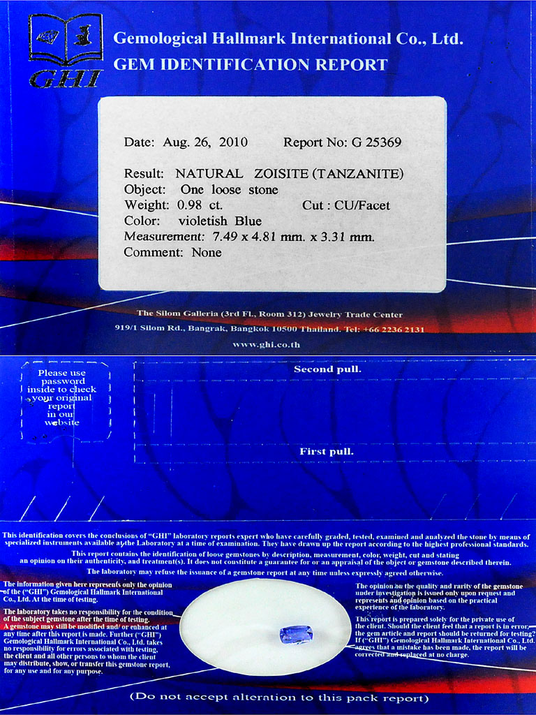 Certified 0.98 Ct. Natural Cushion Violetish Blue Tanzanite Gemstone