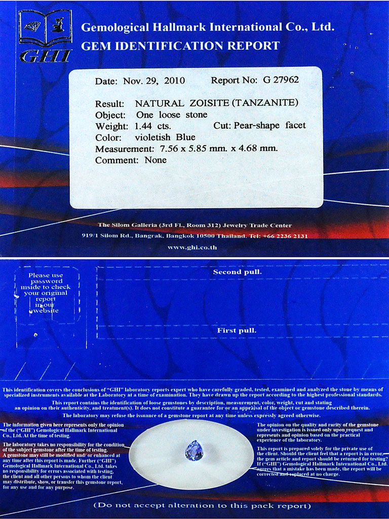 Certified 1.44 Ct. Clean Pear Shape Natural Gem Violetish Blue Tanzanite